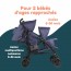 Maniable et compacte, cette poussette est idéale pour les enfants d'âge rapprochés. Poussette double pour enfants rapprochés 6-36 mois pour le siège avant (max 15kg). 0-36 mois pour le siège arrière (max 15kg) qui s'allonge complètement. Elle est dotée de suspension intégrale et de frein mono-action. Toute équipée, elle est livrée avec habillage pluie et grand panier, 2 canopy amovibles.