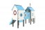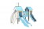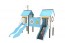 Structure pour aire de jeux à sceller au sol pour 12 enfants environ. Comprend : 2 tours avec toit, 1 escalier, 1 mur à grimper, 1 passerelle, 1 glissière. Lire plus